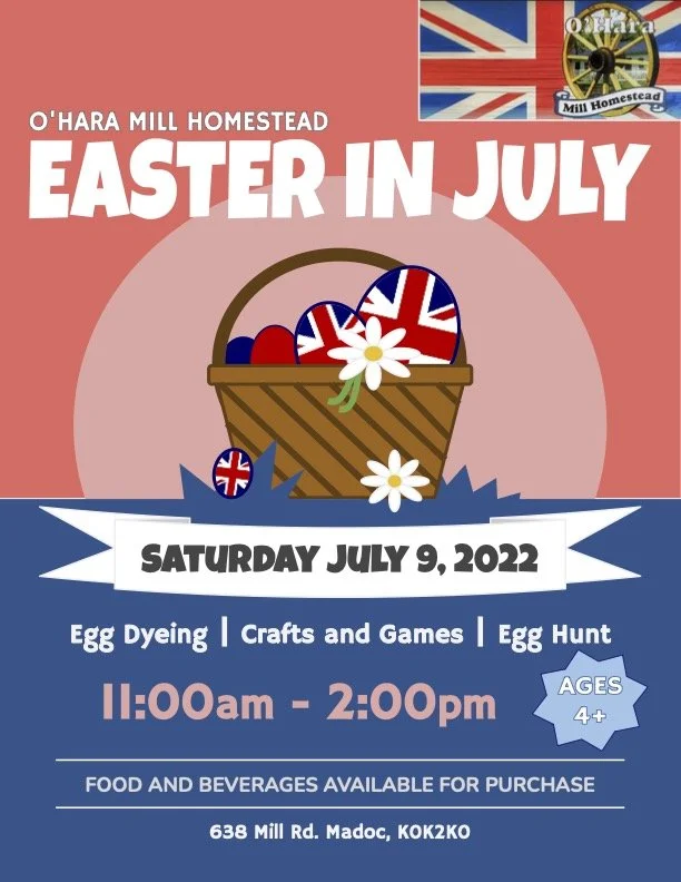 Easter in July Saturday, July 9, 2022 11:00 AM 2:00 PM 11:00 14:00 O'Hara Mill Homestead and Conservation Area 638 Mill Road Madoc, ON, K0K 2K0 Canada (map) Google Calendar ICS